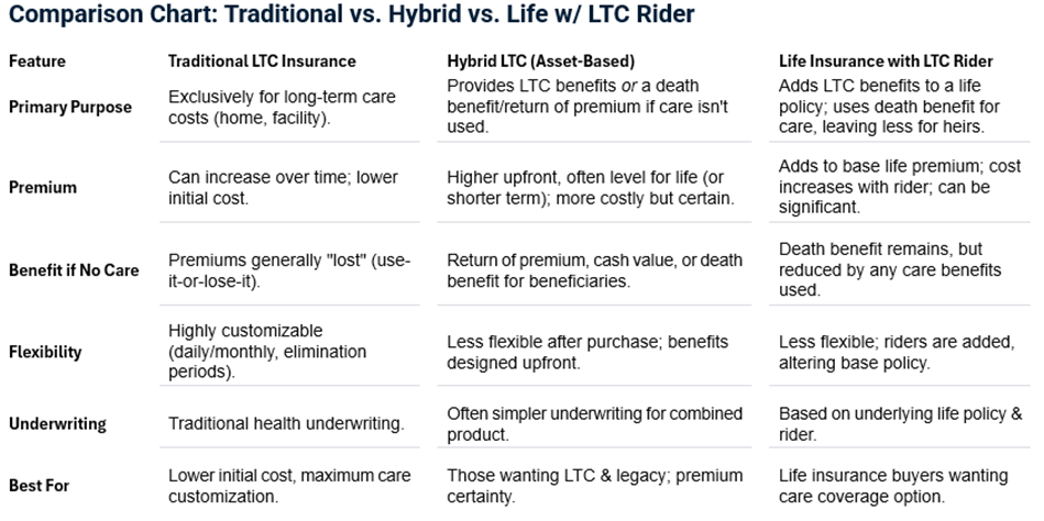 Hybrid LTC Insurance or Linked Benefit Insurance: This combines LTC benefits with life or annuity coverage depending on the product solution and can be funded for specific product durations - 1, 5, 10, 15 years, age 100. It also accepts 1035 rollovers from other existing life/annuity products. These options pay LTC claims if needed but provide a death benefit to heirs if not used.